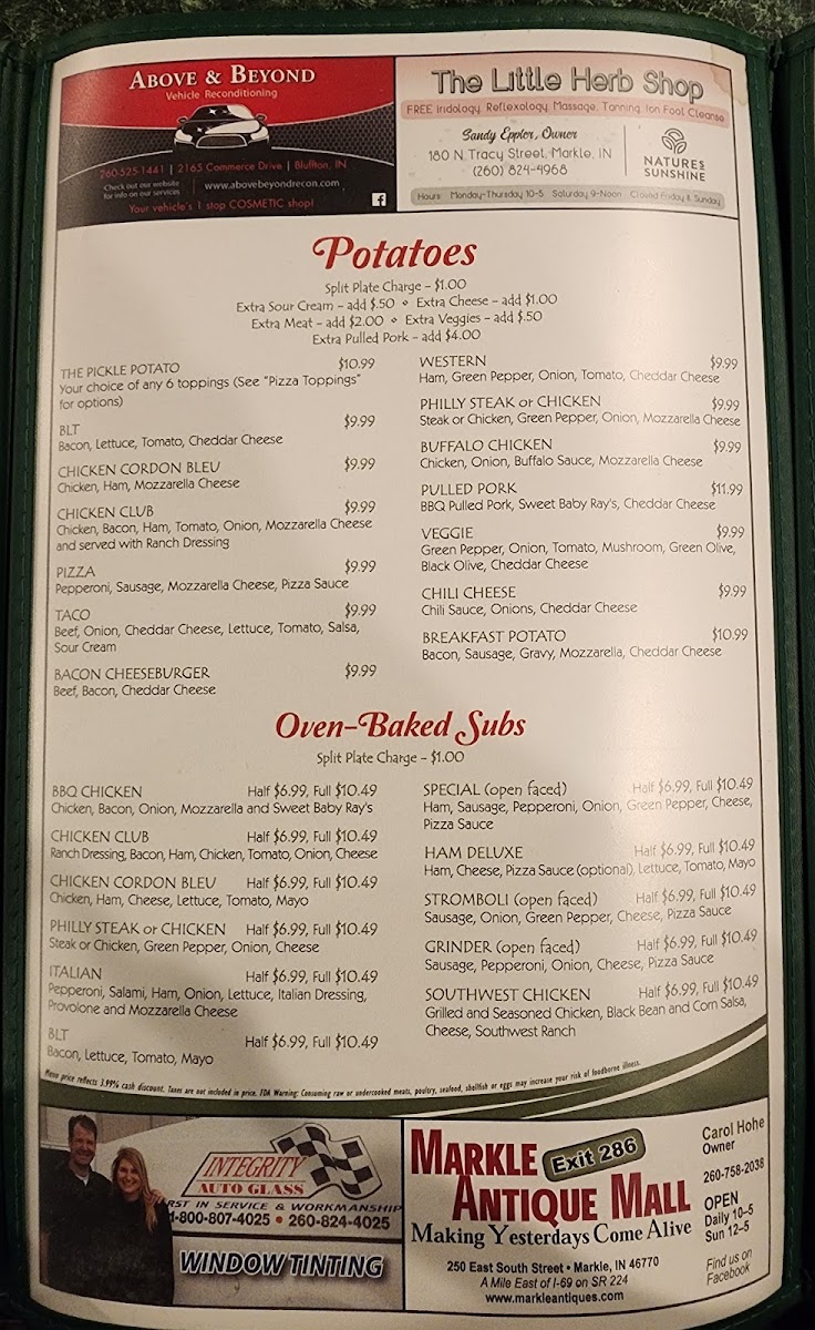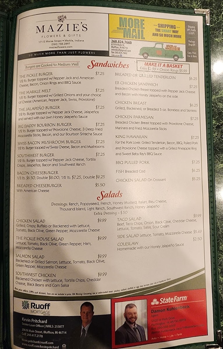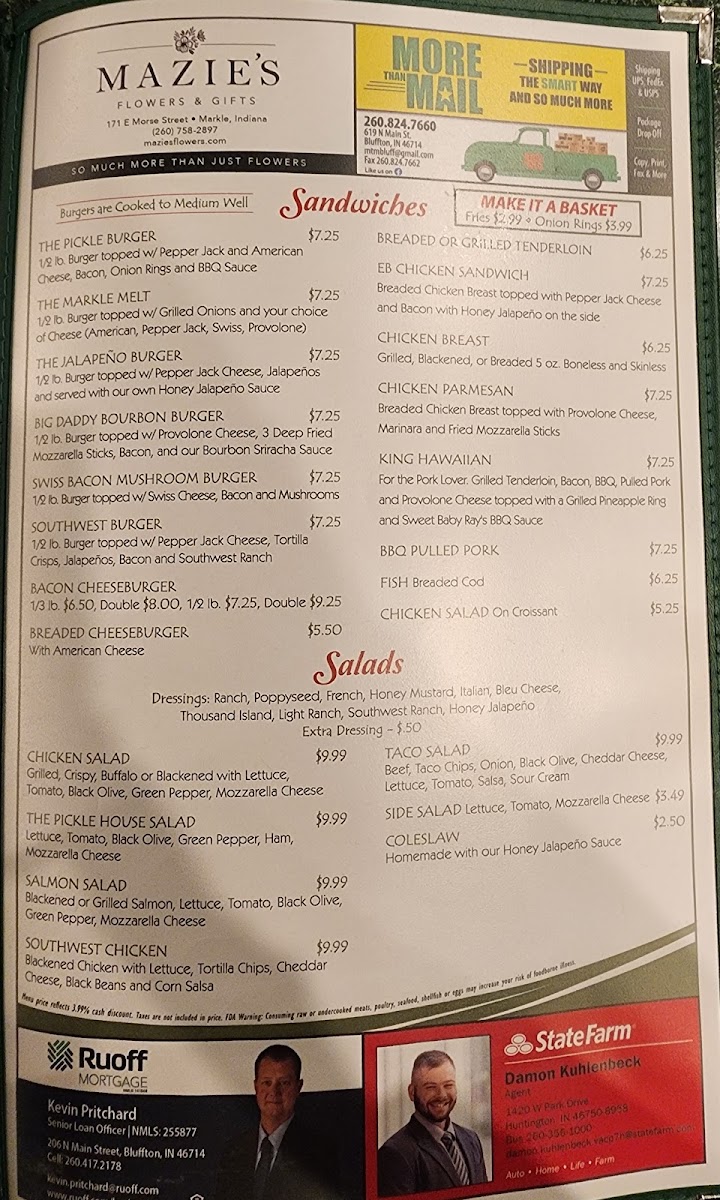 Discover the charm of The Pickle, a delightful bar and grill located in the heart of Markle, IN. This cozy spot offers a diverse menu that captivates with its hearty offerings. From the rich, 12 Oz. Ribeye at just $18.99 to the tempting Chicken Parmesan, each dish showcases a commitment to flavorful, quality ingredients. Seafood lovers can savor grilled shrimp or the succulent blackened salmon, while those seeking comfort can indulge in their Fish & Chips or the unique Pizza Potato—a local favorite!
