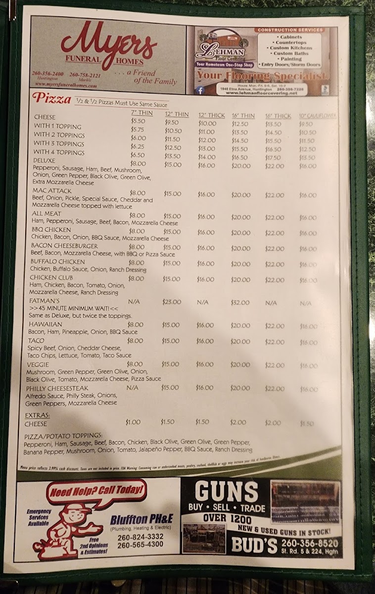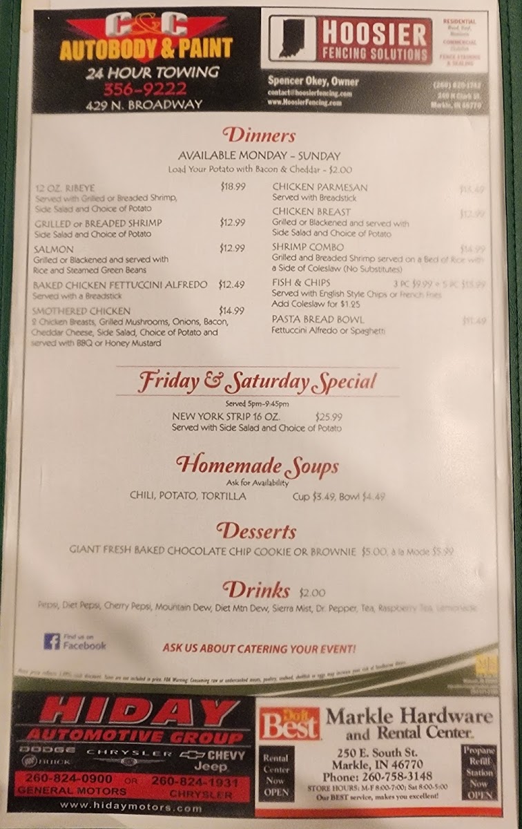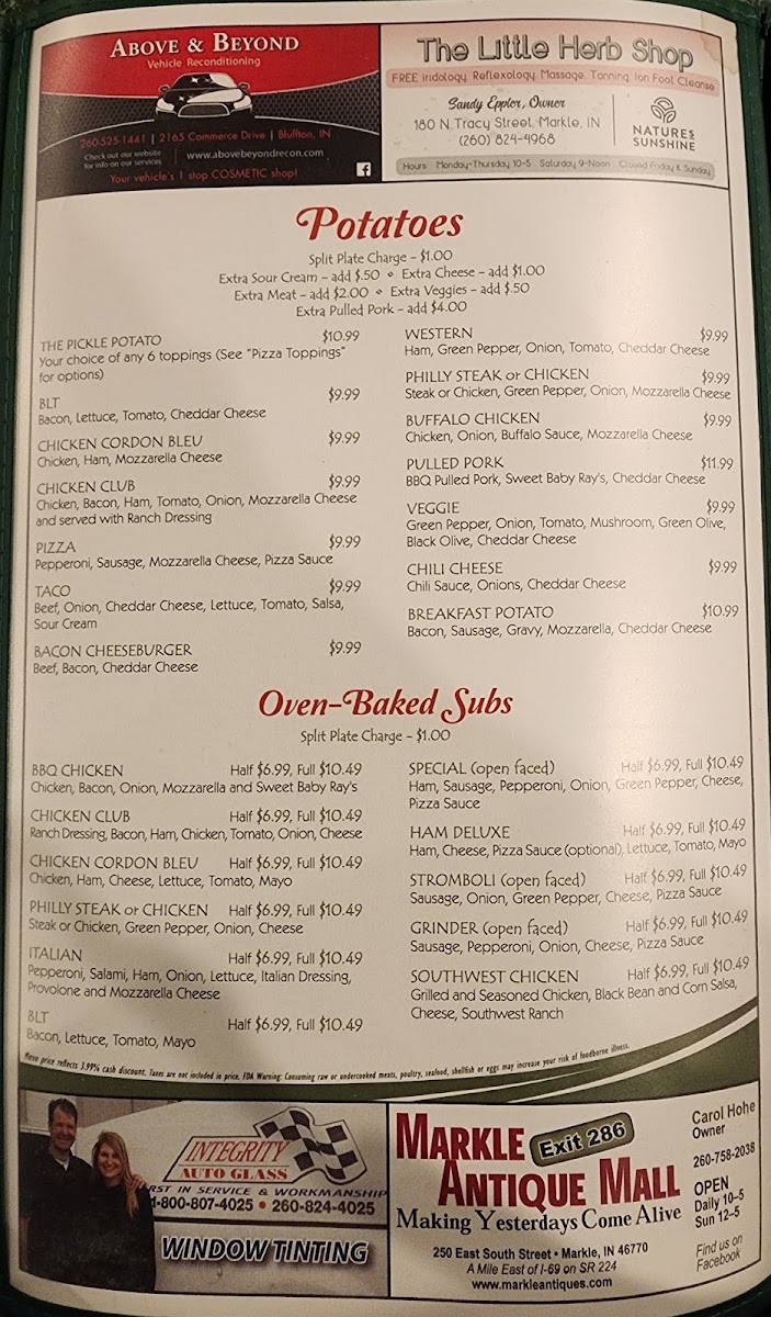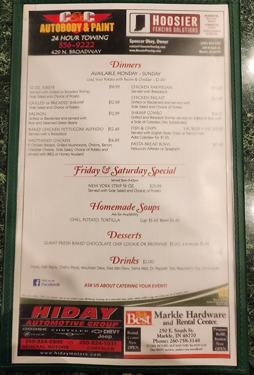 Discover the charm of The Pickle, a delightful bar and grill located in the heart of Markle, IN. This cozy spot offers a diverse menu that captivates with its hearty offerings. From the rich, 12 Oz. Ribeye at just $18.99 to the tempting Chicken Parmesan, each dish showcases a commitment to flavorful, quality ingredients. Seafood lovers can savor grilled shrimp or the succulent blackened salmon, while those seeking comfort can indulge in their Fish & Chips or the unique Pizza Potato—a local favorite!